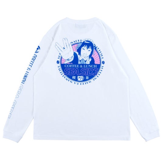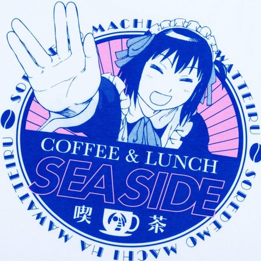合言葉は「めいど!」下町のありふれた喫茶店…ではなく、れっきとしたメイド喫茶『シーサイド』の公式グッズとしてロングスリーブTシャツが登場!フロントと左袖には店名をモチーフとしたプリント、背面には店のトップメイド(?)歩鳥が合言葉と一緒に「めいどサイン」!