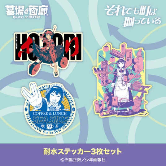 『それでも町は廻っている』の主人公・嵐山歩鳥の印象的なイラストを、機能性の高い耐水ステッカー仕様で3枚セットでリリース!おなじみ「めいど!」ポーズの歩鳥、丸子商店街をバックに80年代SFコミックテイストな歩鳥、そして世界的人気のサイバーパンクアニメ風の歩鳥の豪華3点セット!