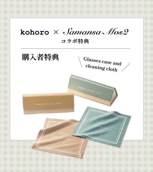 kohoro(コホロ)とサマンサ モスモスのコラボレーションによるメガネを購入すると、オリジナルデザインのメガネケースとトレシー(メガネ拭き)をプレゼント!ベージュイエローとスモーキーブルー、お好みの色をセレクトできます。
