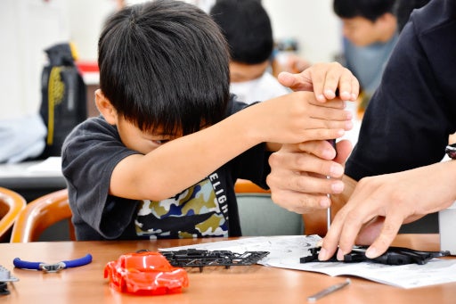 説明書を参考にしながら親子で一緒に組み立てます。レーシングドライバーのアドバイスを受けられます。
