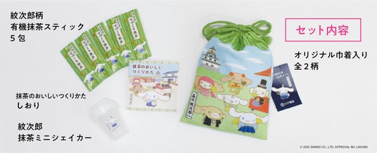 ・品川紋次郎 抹茶ミニシェイカー ・紋次郎柄 有機抹茶スティック 5包 ・つかいかたのしおり