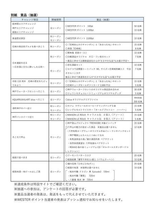 各チャレンジのスタンプ獲得数に応じて、抽選で各地域の魅力が詰まった素敵な賞品やWESTERポイントをプレゼントします。