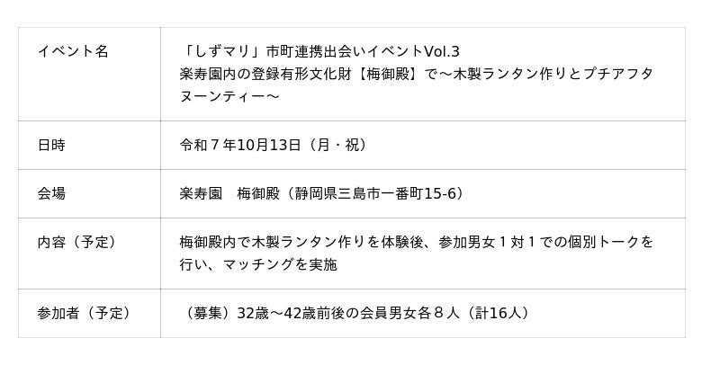 今回は、三島市、伊豆市、長泉町と連携し、梅御殿(三島市)で婚活イベントを開催します。