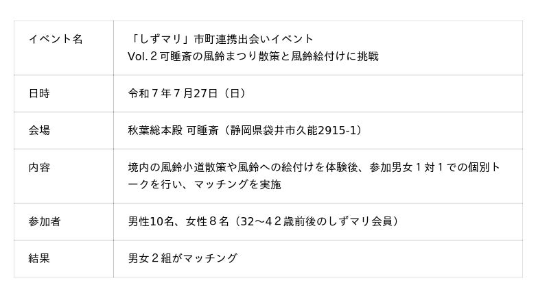 県と市町が運営する公的な結婚支援拠点「しずおかマリッジ」では、マッチングシステムによる出会いの機会の提供に加え、地域資源等を活用した各種イベント・セミナーを開催し、会員同士の直接の出会い・交流の場を提供しております。