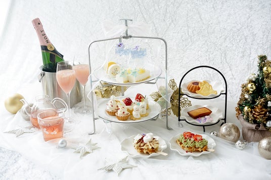 華やかなドレスを中心とした装飾を間近に感じられる店内で、優雅なひとときをお過ごしいただける『お花のアフタヌーンティーセット』をご用意。ホワイトクリスマス魔法をイメージした輝く雪の結晶がのったレアチーズケーキやバタフライピーの紅茶を使用した輝きのあるオリジナルゼリー。スノーマンのマシュマロ、ツリーのタルトをはじめ、キャンドルをイメージしたミルクレープのプチケーキ、中のジャムが隠し味のオリジナルジュレマカロンなど、ホワイトクリスマスの世界感を存分に感じられるキュートなスイーツたちが並ぶ、シーズン限定のスペシャルなアフタヌーンティーです。