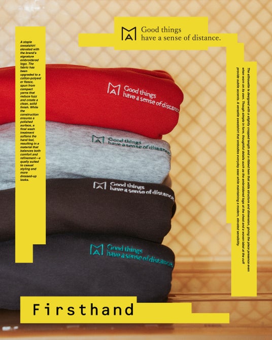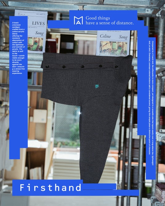 「Good things have a sense of distance. =いいモノには距離感が必要」をコンセプトに、ユニセックスカシミヤブランド「BODHI」のデザイナー・水谷 倫(みずたに さとし)氏を監修に迎えるMA Firsthand。キーフレーズである「Good things have a sense of distance. 」は、新しいものと古いもの、伝統と最先端、男性と女性など世の中に対比される物事のなかで、お互いの良さを認め合うちょうどいい距離=「間」を知るというコンセプトを表現。