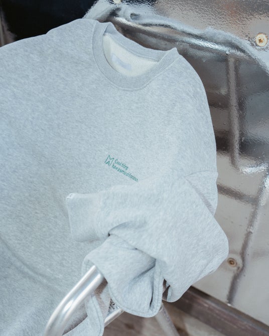 定番メッセージ“GOOD THINGS HAVE A SENSE OF DISTANCE”を右胸にワンポイント刺繍したクルーネックスウェット。