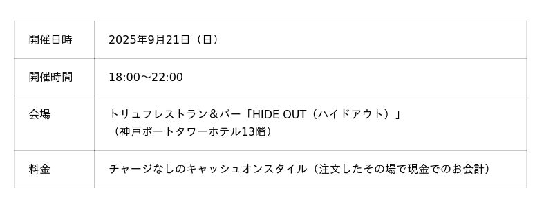イベント詳細サイト:https://www.kobe-porttower-hotel.com/hideout/kobebarportcruise/