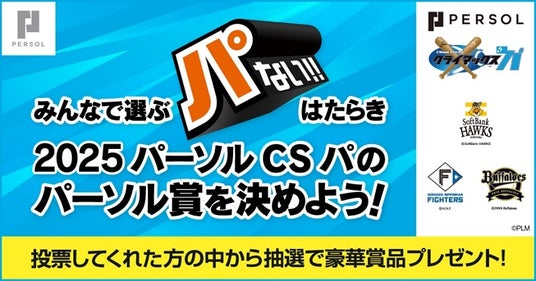 「はたらいて、笑おう。」をグループビジョンに掲げるパーソルホールディングス株式会社(本社:東京都港区、代表取締役社長 CEO:和田 孝雄)とパシフィックリーグマーケティング株式会社(本社:東京都港区、代表取締役CEO:新井 仁)は、「2025 パーソル クライマックスシリーズ パ」のパーソル賞をファン投票で決定するキャンペーンを実施いたします。