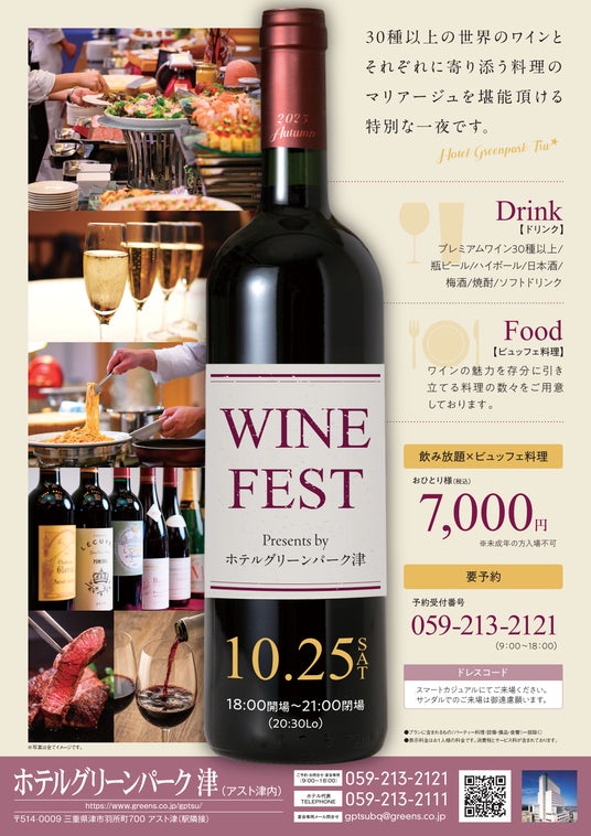 株式会社グリーンズ(本社:三重県四日市市、代表取締役社長:村木雄哉、証券コード:6547)は、2025年10月25日(土)、ホテルグリーンパーク津(三重県津市羽所町)にて、「WINE FESTワイン×料理の祭典」を開催いたします。地域の皆さまやご宿泊のお客様に、世界のワインと料理のマリアージュを存分に味わえる特別な一夜を提供いたします。※本イベントは【完全予約制】となります。
