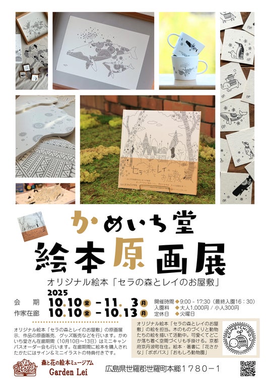 広島県世羅町「森と花の絵本ミュージアムGardenLei」にて、オリジナル絵本「セラの森とレイのお屋敷」の絵を担当する作家「かめいち堂」さんの絵本原画展を開催しています。かめいち堂さんによるペン一本で描かれた緻密なイラストの原画ご間近でご覧ください。