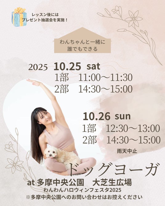 【ヨガマット不要】ゆかり先生のドッグヨーガアクロバットパフォーマー・ドッグヨーガインストラクターのゆかり先生のドッグヨーガのレッスンが、体験料金ワンコイン500円(通常料金3,000円 ※多摩中央公園での通常レッスンはありません)でご参加いただける貴重な2日間です!ぜひこの機会にご参加ください。