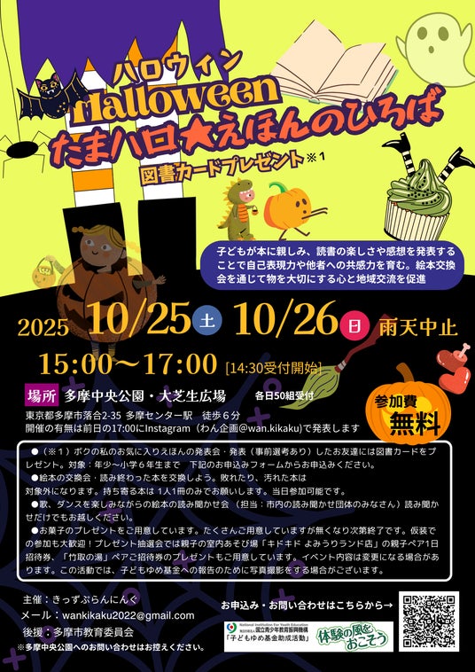 たまハロ★えほんのひろば同時開催【企画の目的】子どもが本に親しみ、読書の楽しさや感想を発表することで自己表現力や他者への共感力を育む。絵本交換会を通じて物を大切にする心と地域交流を促進します。