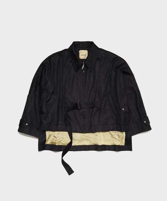 先染めのシルクデニムを表地に使用し、デニムのカジュアル感とシルクの柔らかさを兼ね備えた上質素材。裏地には「株式会社いづつ」で手絞り染めを施したキュプラ100%を贅沢に採用。ポンチョ型ジャケットは3WAY仕様で、ベルトを通してウエストをシェイプ、前だけ通してバックフレアを楽しむ、ベルトを外してテントラインに着崩すなど自在な着こなしが可能。ドルマンスリーブと前後差のある丈でインナーも着やすく、洗練された一着です。