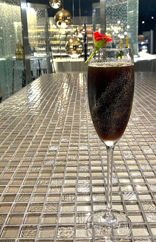 第一弾の「アール・デコとモード」展は、金粉を吹きかけたグラスでご提供する、シャンパンにコーヒーとダークカカオを合わせた黒いシャンパンカクテル「Robe Noir(ローブノワール)」です。メインビジュアルの中心を飾る、ラインストーンとビーズ刺繍で装飾されたメタリックな印象のドレスにインスピレーションを受け、落ち着いた甘さの中にコーヒーのほろ苦さが溶け込む、”大人な”カクテルに仕上げました。