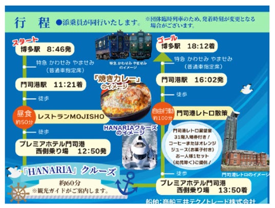 (1)ツ ア ー 名 称:「特急 かわせみ やませみ」で行く!HANARIAクルーズ&門司港散策(2)出 発 日 :2025年月10月25日(土) 日帰り