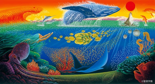 この絵本は「夕日が水平線に沈んだあと、どこへ行くのだろう?」というテーマで、夕日が沈んだ後、海中でたくさんの生き物と出会う様子が、鮮やかな色彩と繊細なタッチで描かれています。