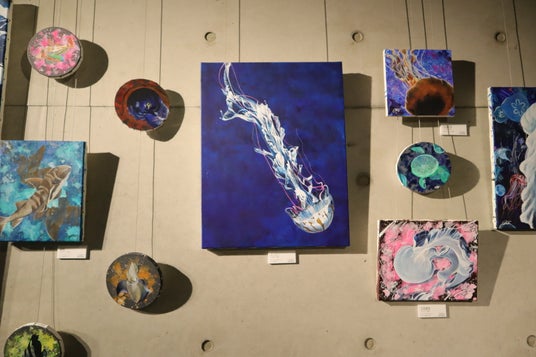 本展では、当館で展示している生きものや水槽を参考にして、新たに描き下ろされた作品を14点展示しています。ラメの絵具を使用し、角度によって見え方が異なる仕掛けがあるものや、重ね塗りにより独特な色合いを表現したものなど、正面からだけではなく様々な角度からご覧いただき、見え方の変わる作品となっています。