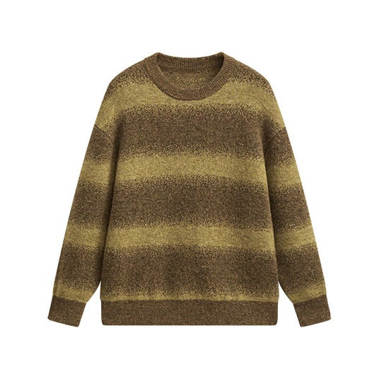 STRIPED SWEATER 20,900円 上質な糸を贅沢に使用したラウンドネックニットは、柔らかさとドライな質感を絶妙に融合させた一枚。スプレーペイント風の横縞が遊び心を添え、カジュアルからモードまで幅広く対応。