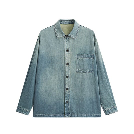 VELOUR SHIRT JACKET 20,900円 クラシックなラペルが美しく首元を彩るデニムジャケット。ビンテージウォッシュで味わい深く、日常に自然と馴染む風合い。