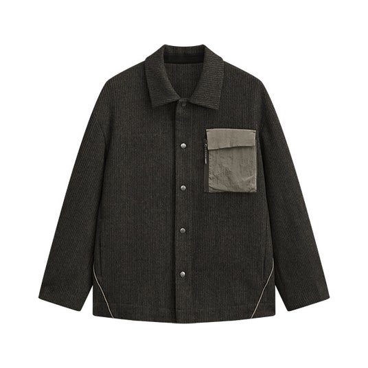 TWEED SHIRT JACKET 49,500円 クラシカルなツイードウールとストライプ柄を融合したショート丈ジャケット。ドロップショルダーでリラックス感を演出し、ナイロンパネルポケットやコントラストディテールで実用性とデザイン性を両立。オンオフ問わずアーバンモードなスタイルを完成させる一着。