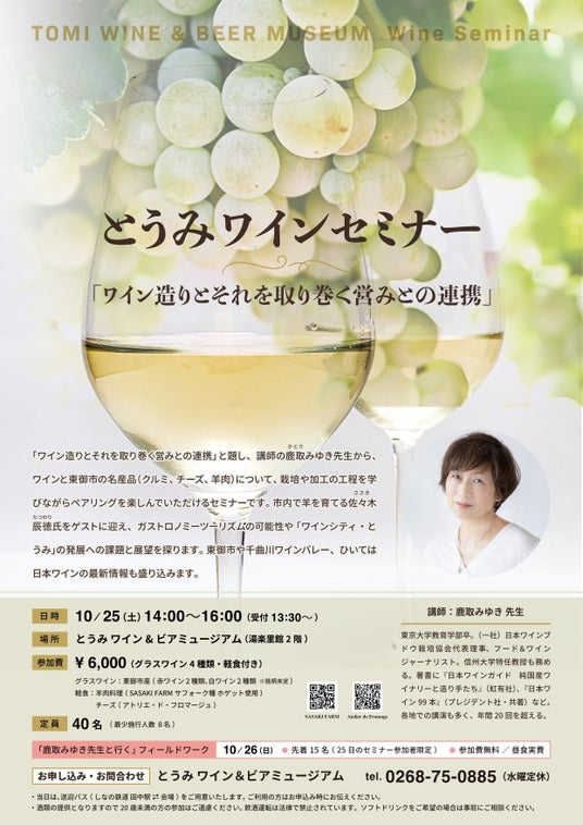 講師には日本ワイン界の第一人者・鹿取みゆき氏を迎え、地元農畜産物とワインのペアリングを体験しながら、地域のワイン産業の可能性を探ります。
