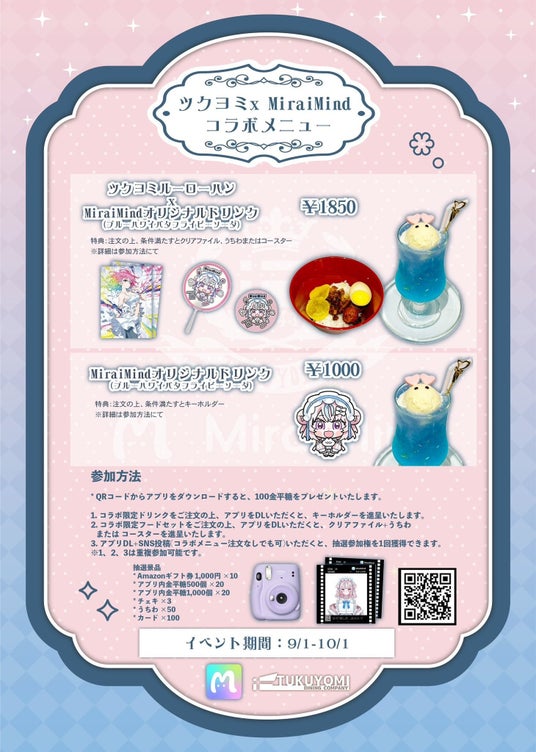 期間中は、ここでしか体験できない限定メニューやオリジナルグッズ、さらに豪華景品が当たる抽選企画を実施。MiraiMindのキャラクターとリアル空間で出会える特別な機会です。
