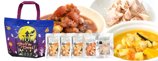 ハロウィンのシンボルであるカボチャをたっぷり使った「鶏肉とかぼちゃのポタージュ」を3袋、乾燥しがちなこれからの時期に水分補給としてもオススメのスープタイプを1袋、国産ささみを食べやすい一口サイズにカットしたレトルト1袋の合計5袋をセットにしました。いつものフードにトッピングすれば、簡単ハロウィンディナーに早変わり。ハロウィン限定ギフトバッグ付きです。特別価格1,800円でのご提供です(通常価格2,500円が28.0%オフ)。<ハロウィンレトルトセットの内容>