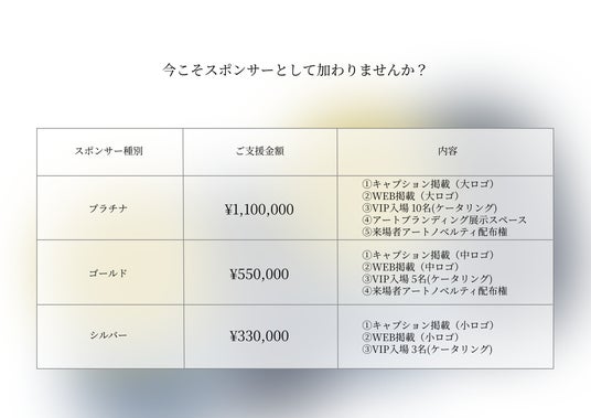 このイベントで生まれる体験は、参加者の心に記憶として残ります。 その記憶にスポンサーの存在も重なり、体験とブランドの価値が共に深まる場です。 スポンサーは単なる支援者ではなく、記憶を共につくる仲間として参加を募集しております。