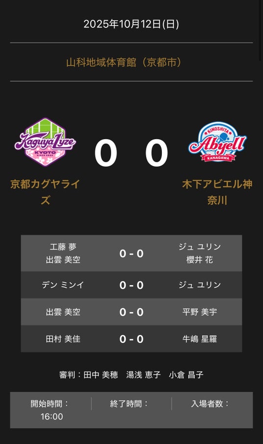 ノジマTリーグ 2025-2026シーズン 公式戦 10月12日開催 「京都カグヤライズ vs 木下アビエル神奈川」の対戦オーダーを発表いたします。