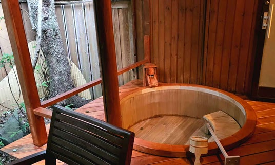 檜の桶と陶器の風趣を映す露天風呂
