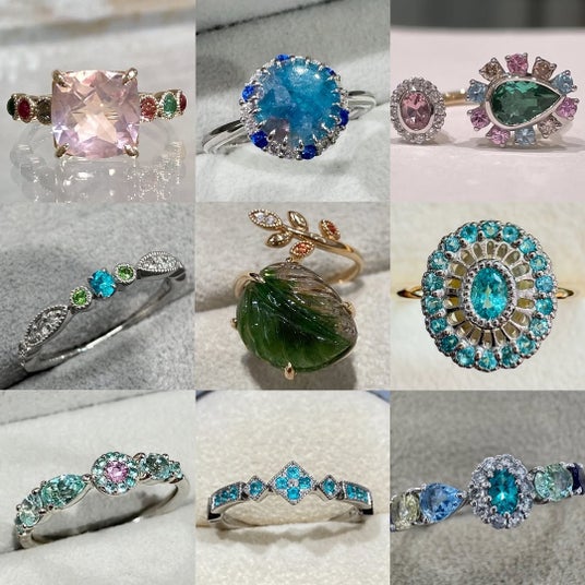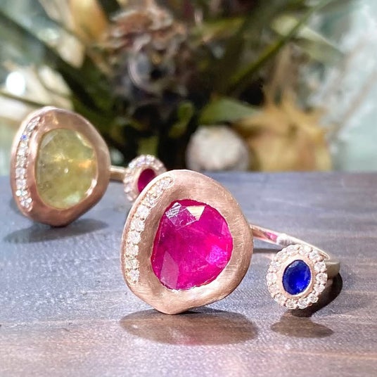 これまでイベントなどで限定品としてご紹介してきたジェルメが、パーセル ジュエリーなんば店に入荷いたしました。このデザインでお仕立てできるルースの数は限られており、常設店で展開する機会は多くありませんが、今回はなんば店で、しかも9色でご覧いただけます。