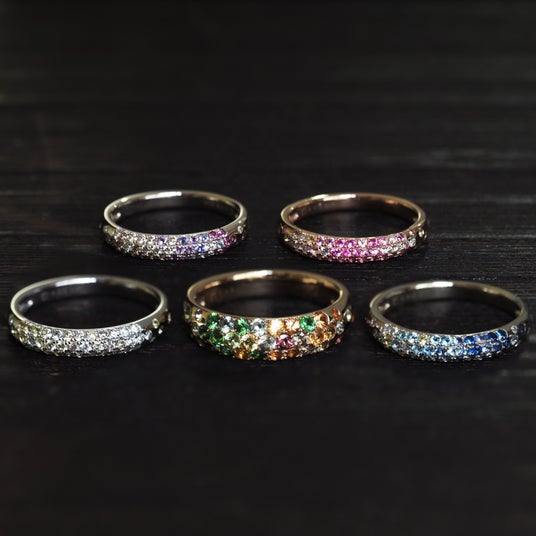 指に通したときの感触と光の移ろいをお確かめください。宝石それぞれが放つきらめきを感じていただけます。