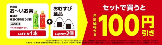 第7弾として、ファミリーマートのおむすびいずれか2個と、「お~いお茶 緑茶」もしくは「お~いお茶 濃く香るほうじ茶」いずれか1本をセットで買うと合計金額から100円引きとなるキャンペーンを実施いたします。秋の行楽にもピッタリな組み合わせがお得に手に入るチャンスです。