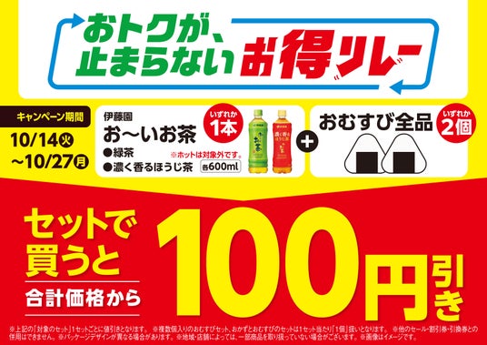 株式会社ファミリーマート(本社:東京都港区、代表取締役社長:細見研介)は、継続して取り組んでいる5つのキーワードの一つである「たのしいおトク」の一環として、飲料・チキン・パン・おむすびなど、様々な商品がおトクになる「ファミマのお得リレー」を全国のファミリーマート約16,400店で開催しております。キャンペーン第7弾は、2025年10月14日(火)から10月27日(月)まで、おむすびいずれか2個と「お~いお茶 緑茶」もしくは「お~いお茶 濃く香るほうじ茶」いずれか1本をセットで買うと合計金額から100円引きとなるキャンペーンを実施いたします。