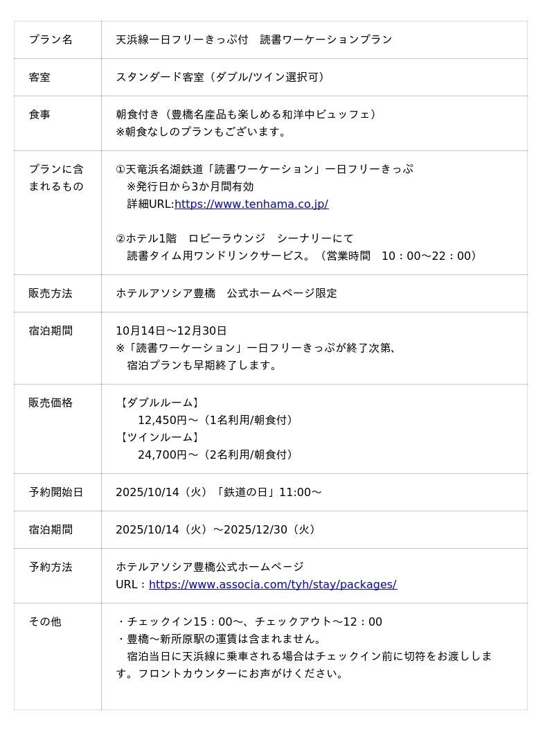 株式会社ジェイアール東海ホテルズ ホテルアソシア豊橋(所在地:愛知県豊橋市 総支配人:中川雅一)は、2025年10月14日(火)~2025年12月30日(火)の期間、「天浜線一日フリーきっぷ付 読書ワーケーションプラン」を販売いたします。