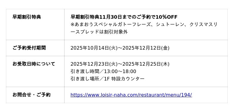 ソラーレ ホテルズ アンド リゾーツ株式会社(所在地:東京都港区、代表取締役社長:井上 理)が運営するロワジールホテル&スパタワー 那覇では、2025年のクリスマスシーズンに向けて、ホテルパティシエが丁寧に仕上げた特別なクリスマスケーキのご予約受付を10月14日(火)より開始いたします。