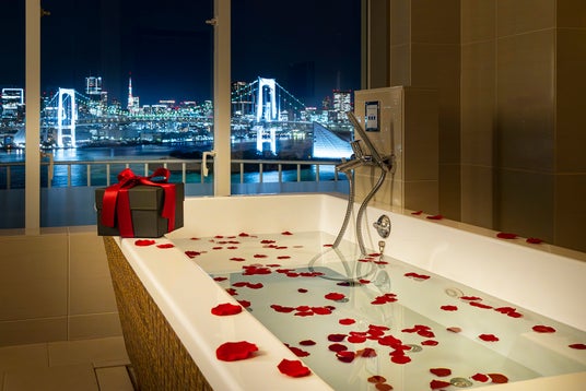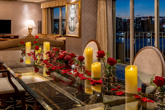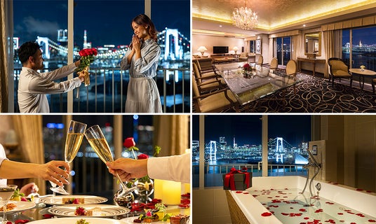 さらに、バラが彩るベッドルームやバスルーム、そしてプロポーズを演出する “ダズンローズ”などもご用意します。静寂に包まれたプライベートスイートで迎えるプロポーズの瞬間を、東京湾の夜景とともに。お二人の一生の記憶に残る、かけがえのない一夜をお届けします。