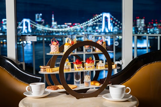 夜景を背景に並ぶ、季節のケーキや焼き菓子など色とりどりのデザートは、写真にも記憶にも残るひとときを演出します。