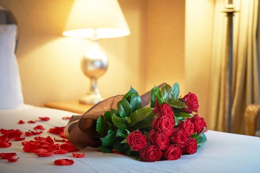ベッドルームに用意されたダズンローズの花束とともに、想いを伝える瞬間。