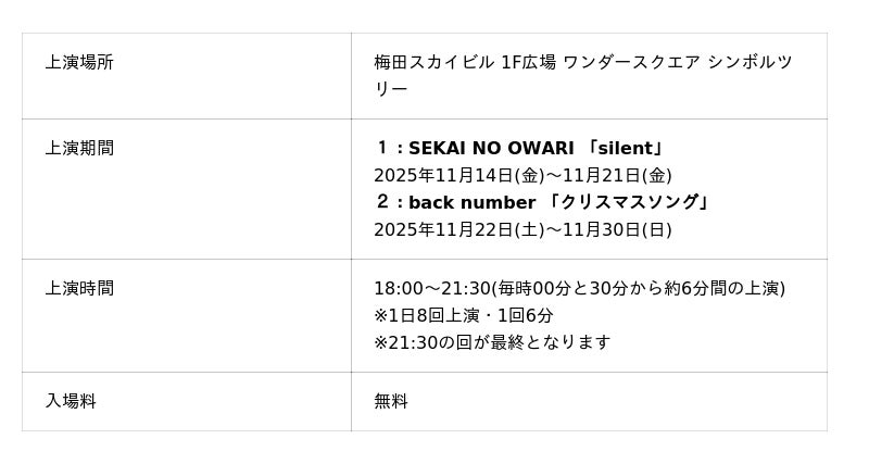 梅田スカイビル 1F広場「ワンダースクエア」にて11/14(金)~12/25(木)の期間中「UMEDA SKY BUILDING Christmas 2025」が開催されます。