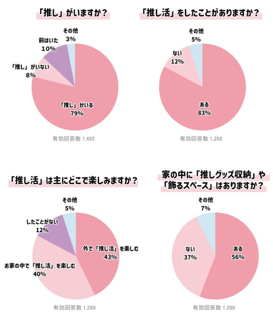 ロマンティックプリンセス公式Instagramのフォロワー19万人(*1)を対象に実施したアンケート調査によると、約80%のユーザーが「推しがいる」と回答。そのうち56%のユーザーが「自宅に推し活スペースがある」と回答しました。「推し活をしたことがあるユーザー」は約80%に達し、「自宅で推し活を楽しむユーザー」は、「外出先で推し活を楽しむユーザー」とほぼ同等の割合にあることが判明しました。これにより、推し活市場の拡大が明らかとなっています。一方で、既存の収納グッズは増えているものの、女性向けに「可愛い」に特化した「推し活収納」はまだ少ないのが現状です。