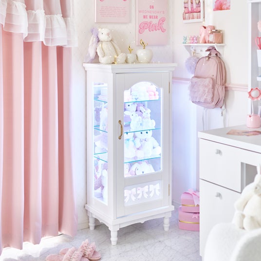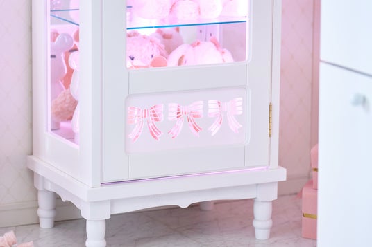 本製品は、色味・彩度・明るさまで細かく調整できるライティング機能により、好みのカラーでライトアップできる点が大きな特徴です。推しのイメージカラーやメンバーカラーに合わせて光を演出することで、推しグッズをより引き立たせる「見せる収納」としてご活用いただけます。さらに、グッズが増えることで雑然としがちなコレクションスペースも、本製品を使用すれば整理しながら美しくディスプレイすることが可能です。収納としての機能性はもちろん、扉下部にあしらったリボンのデザインやクラシカルな曲線を取り入れた、インテリア性の高いデザインも魅力です。どのようなお部屋にも馴染みやすいホワイトカラーで、リビングや寝室など幅広い空間に可愛く置くことができます。