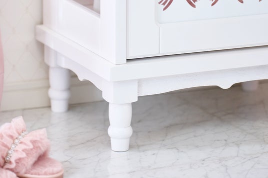 キャビネット前面の扉には、目を引く大きな3連リボンの型抜きデザインを採用しました。上品さと可愛らしさを兼ね備えたアクセントとなり、インテリアとしても存在感を放ちます。