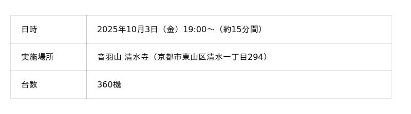 行幸通り、音羽山 清水寺ともに限られたスペースの中で多くのドローンショーの機体が離発着できるというAlterSkyの強みを大いに活かし、無事安全に運航を実施することができました。