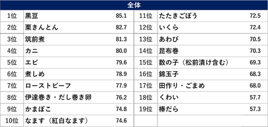 事前調査と本調査に分けて調査を実施。事前調査では「好きなおせち料理」を回答者1名あたり3項目まで自由記述で聴取し、回答が多かった20品目を選抜した。本調査では20品目についてそれぞれ7段階で評価を得た。
