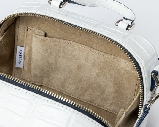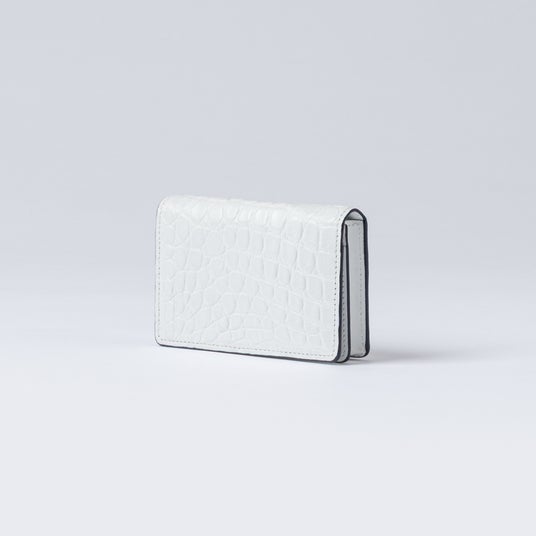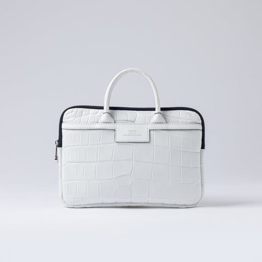 クロコダイルレザーを純白に染め上げ、腑模様の陰影を月光のように際立たせた唯一無二のミニブリーフケース。一枚革から切り出された模様は二つと同じものはなく、持つ人だけの特別な存在となります。