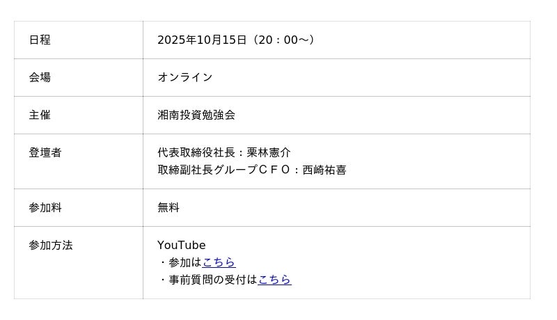【10/15(水)20:00~】個人投資家向けIRセミナーのご案内 ~2026年2月期 第2四半期決算発表に関する内容~