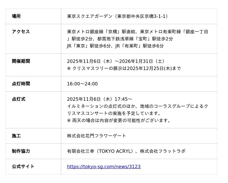 東京建物株式会社は、東京建物等が保有および管理する複合ビル「東京スクエアガーデン」(東京都中央区京橋)で、「2025東京スクエアガーデン ウィンターイルミネーション」(以下「本イベント」)を2025年11月6日(木)から2026年1月31日(土)の期間で実施します。