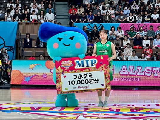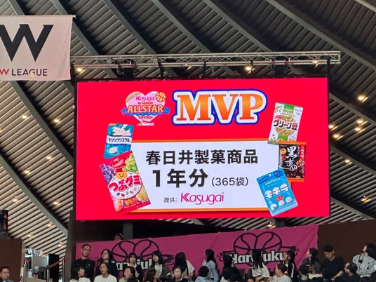 春日井製菓は2026年5月3日(日祝)に国立代々木競技場第二体育館(東京都渋谷区)にて行われる『Wリーグオールスター2025-26 in 代々木』において、3年連続で冠スポンサーもつとめます(写真は2025年5月のオールスター時もの)。選手とファンをつなぐ取り組みとして来場者へのお菓子プレゼントやSNSを活用したプレゼントキャンペーンも予定しています。「つぶグミ」や「黒あめ」などのお菓子が多くの人を笑顔にしてきたように、スポーツ観戦の場にも笑顔の輪を広げていきたいです。